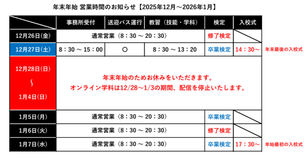 2025.12.04 [Thu] 営業時間のお知らせ 在校生の方へ 当校からのお知らせ 年末年始の営業時間のお知らせ いつも中央自動車学校をご利用いただきましてありがとうございます。 年末年始の営業時間をお知らせします。 年末年始に伴い、皆さまにはご不便をおかけいたしますが、何卒ご理解いただきますようお願い申し上げます。 お問合せ等ございましたら、ホームページの各フォームよりお願いいたします。 この記事をシェアする シェア Tweet